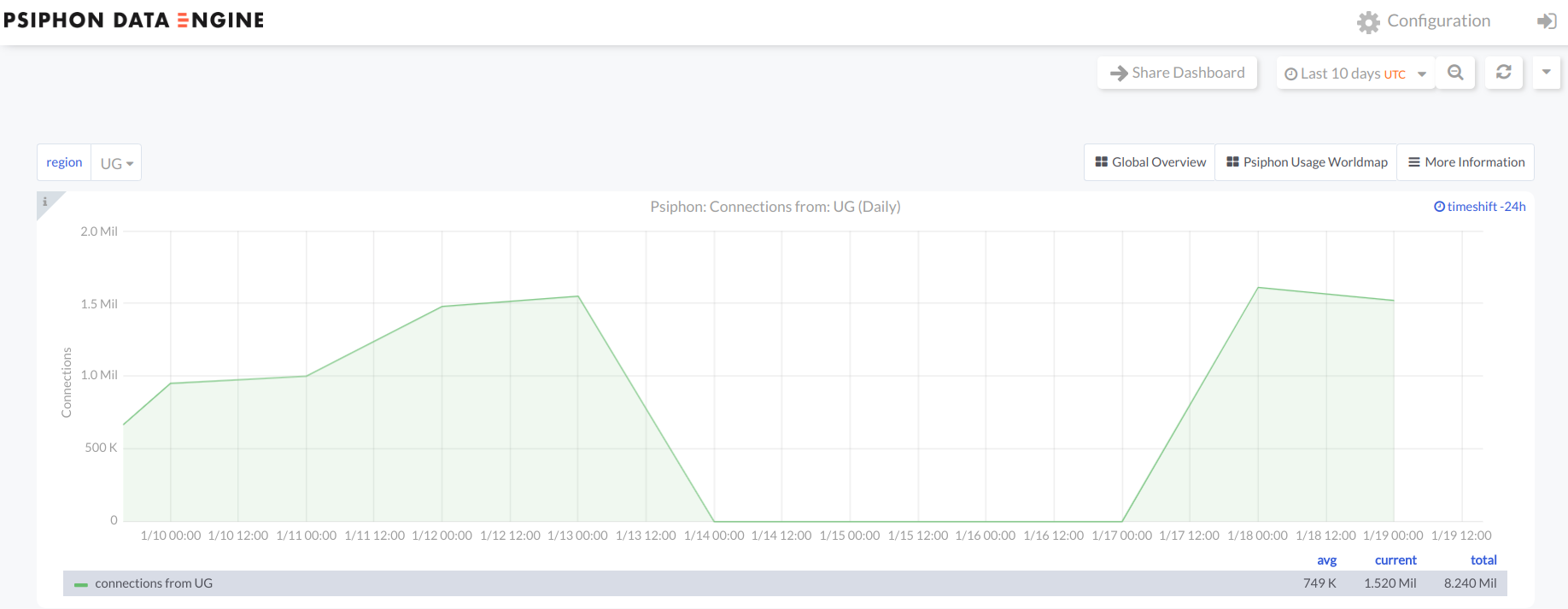 As the same internet outage (involving the same dates and times) is shown through four separate data sources, we are confident that Uganda experienced a severe internet outage amid its 2021 general election. This is further suggested by the absence of OONI measurements from Uganda during this time period (since OONI Probe requires internet connectivity to perform tests), as well as by the drastic drop in Tor users and Psiphon users during this period.