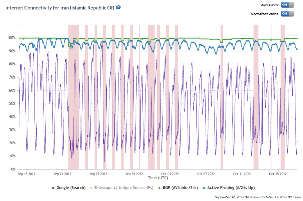 Figure 1: IODA data showing Internet outages in Iran between 16th September 2022 to 16th October 2022 (source: IODA). The red vertical bands indicate outages, which are detected as abnormal drops in the green “BGP” signal. The BGP data source represents routing announcements or global routing information that each ISP router exchanges with other routers, and it is usually quite stable. An abnormal drop can indicate a disruption in Internet connectivity. During the digital curfews, the blue Active Probing and purple Google search signals (see Methods below) are not reaching the maximums they normally would. (IODA’s “telescope” signal is removed from the time series for this view as it does not provide additional information.)