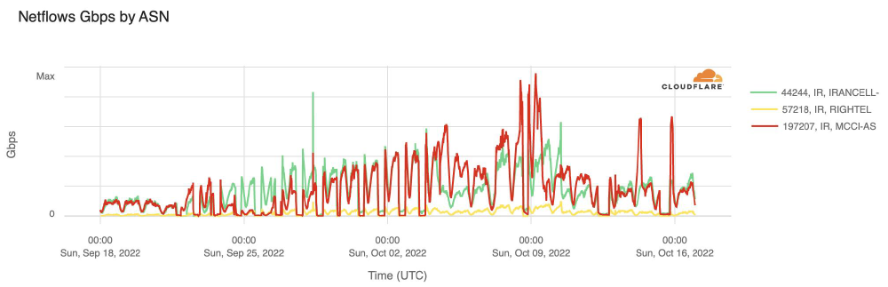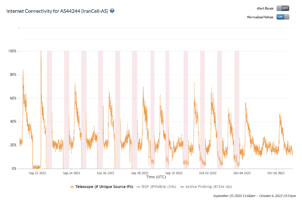 Mobile network outages (IODA, Cloudflare, Kentik)Between 21st Sept. to 3rd Oct. from 4 PM to midnight daily, and again on 8th, 12th, and 15th Oct.The Iranian government enacted a “digital curfew” by shutting down access to 3 major mobile networks (Irancell, Rightel, and MCCI) in the evenings.Users on these networks lost all Internet connectivity. They could access the Internet only through fixed-line or satellite providers. This may have had a severe impact on protest documentation.
