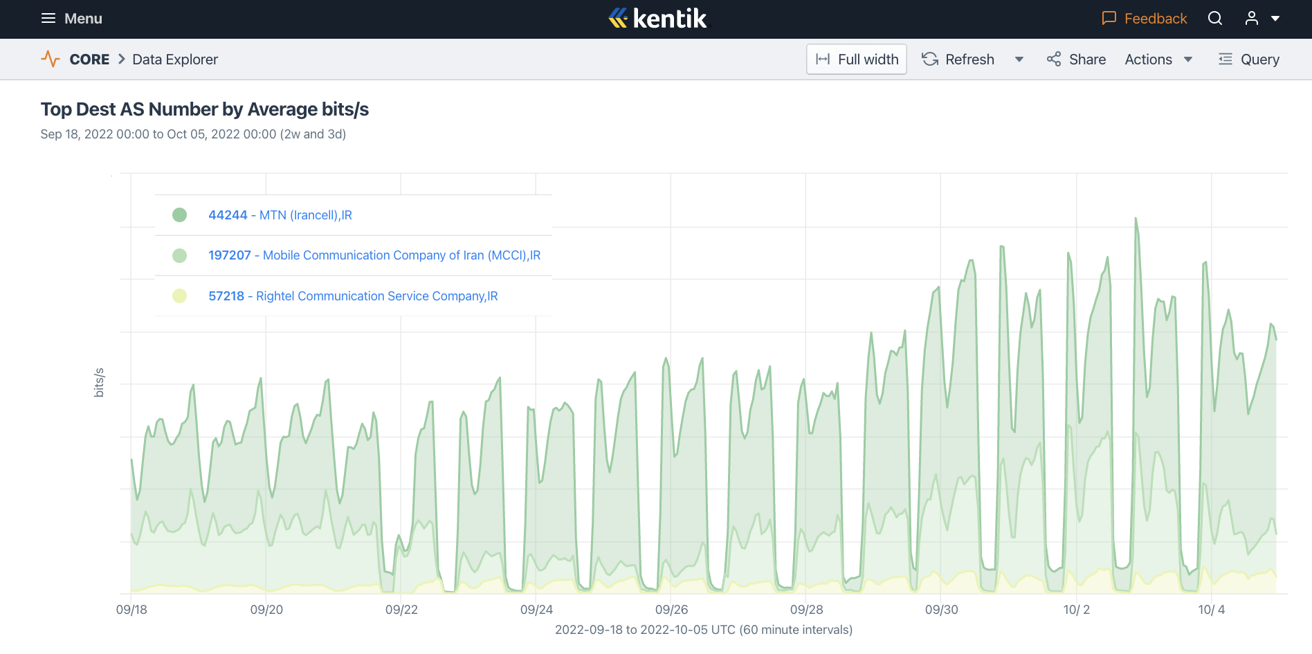 Figure 19: Graph showing Kentik traffic volumes from Facebook (AS32934) to the Iranian three mobile carriers Irancell (dark green), Rightel (yellow), and MCI (light green) between 18th September 2022 and 5th October 2022 (source: Kentik).