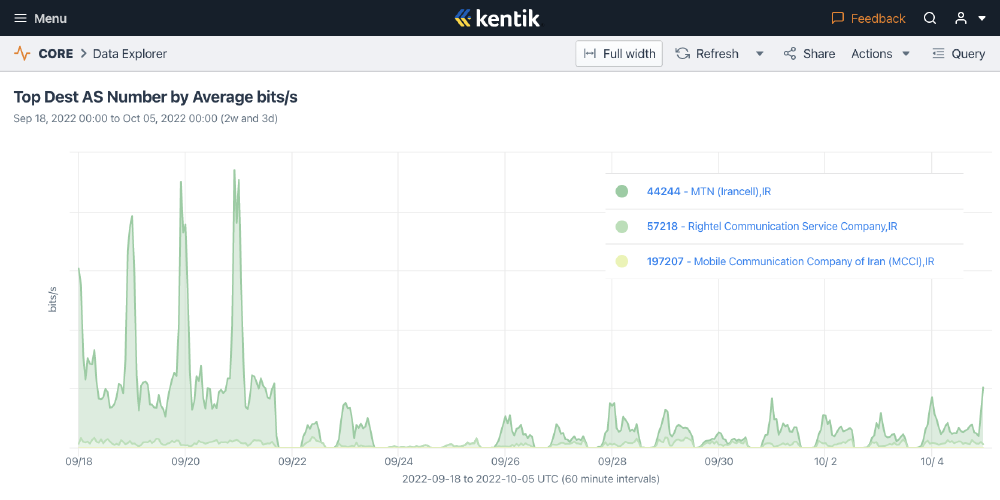 The mobile network outages are further corroborated by Kentik data (Figure 5), which shows daily drops in traffic from Irancell, MCCI, and RighTel during the same date range.