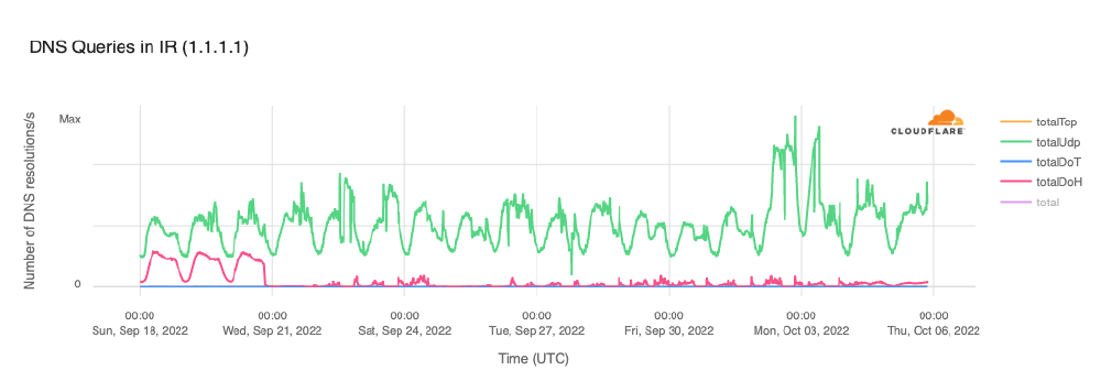 Figure 13: Traffic to Cloudflare 1.1.1.1 resolver from clients in Iran (source: Cloudflare).