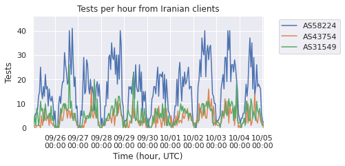 When users had at least some Internet connectivity, they were able to connect to network diagnostic tests such as M-Lab’s. Since mid-September 2022, M-Lab data shows a marked increase in daily tests from 5 Iranian ISPs, particularly for Iran Telecommunication Company PJS and Irancell. Figure 14 shows the daily diagnostic test volumes for the five Iranian providers with the most tests observed in the M-Lab dataset.