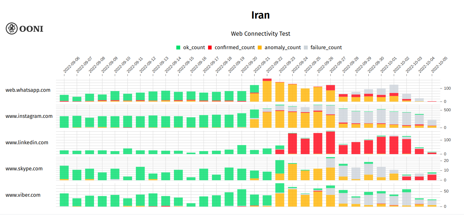 As of 21st September 2022, OONI data shows that many ISPs in Iran started blocking access to WhatsApp endpoints, web.whatsapp.com, and www.instagram.com. In most cases, OONI data shows signs of TCP/IP blocking (disrupting connections with and data transfer to/from the server), with additional blocking via DNS (preventing users from retrieving an IP address for the server’s domain name) and TLS (preventing users from securing their connections with the server). As of 23rd September 2022, OONI data shows the blocking of Skype and Viber, while the blocking of Linkedin is automatically confirmed on at least 10 networks in Iran.