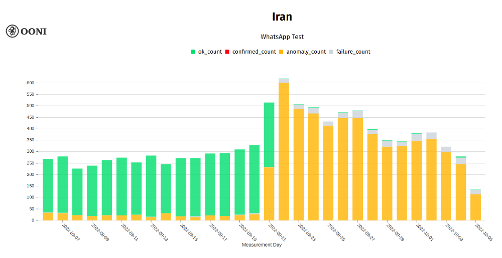 Figure 18: OONI data on the testing of WhatsApp in Iran between September 2022 to October 2022 (source: OONI MAT).