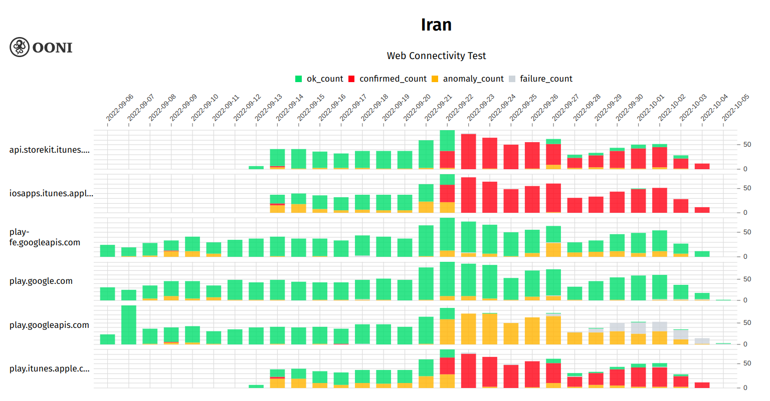 Figure 20: OONI data on the testing of Google Play Store and Apple App Store domains in Iran between September 2022 to October 2022 (source: OONI MAT).