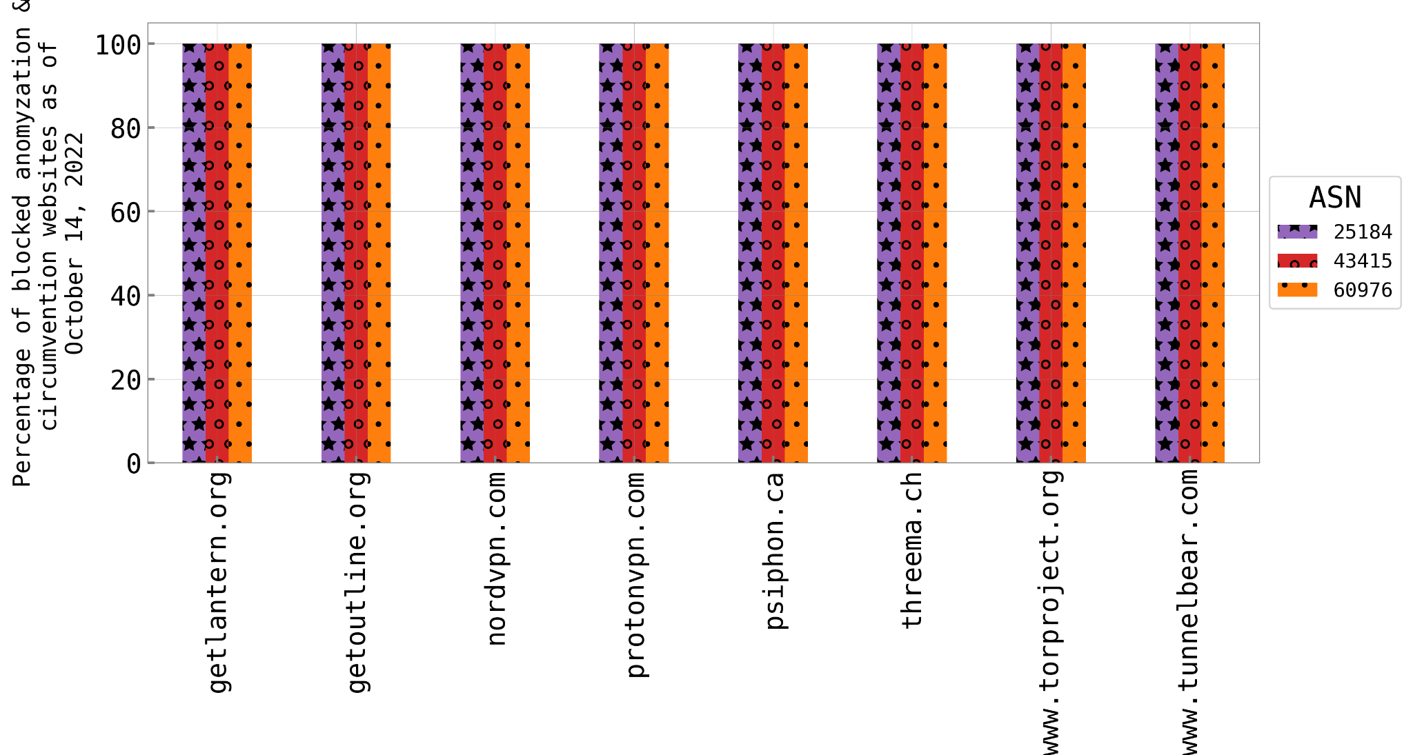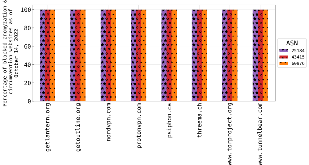 Figure 23: Censored Planet data on the blockage of circumvention and VPN provider websites in Iran as of October 14, 2022 (source: Censored Planet).