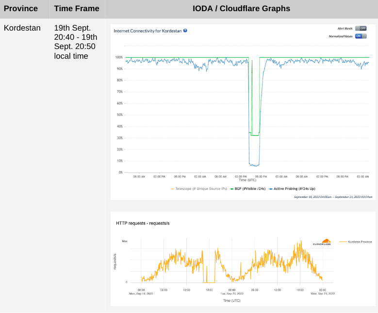 Regional Internet outages (IODA, Cloudflare)Kurdistan province: 19th Sept and 8th-9th Oct (afternoon/ evening) Khuzestan province: 16th Oct (all day)Disruptions to Internet services were observed on multiple days in September and October in Kordestan and Khuzestan. Protests following Jhina Amini’s death were particularly heavy in this province, and protest repression is always treated with far higher levels of severity in these regions dominated by Iran’s ethnic minorities (Iran’s Kurdish and Ahwazi minorities).Users on affected networks in the affected regions lost all Internet connectivity. They could access the Internet only through alternative providers. This, too, may have had a severe impact on protest documentation.
