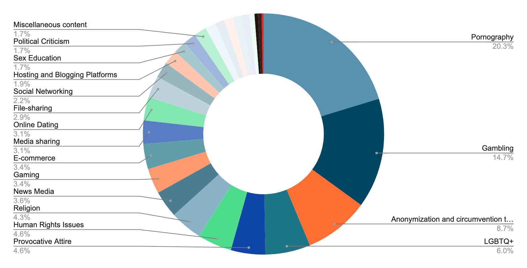 Around half of the blocked websites are related to pornography (20.3%), gambling (14.7%), anonymization and circumvention tools (8.7%) and LGBTQ+ (6%). Other blocked sites found in the measurement data are in the following categories: Provocative Attire (4.6%); News Media (4.6%); Religion (4.4%); Gaming (3.4%); Human Rights Issues (4.6%); and Media sharing (3.1%).