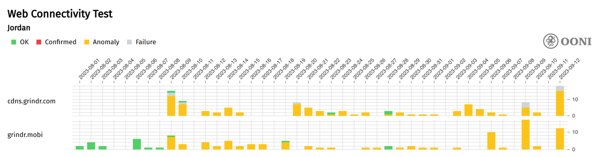 Chart: OONI Probe testing of Grindr endpoints (cdns.grindr.com and grindr.mobi) in Jordan between 1st August 2023 to 12th September 2023 (source: OONI data).