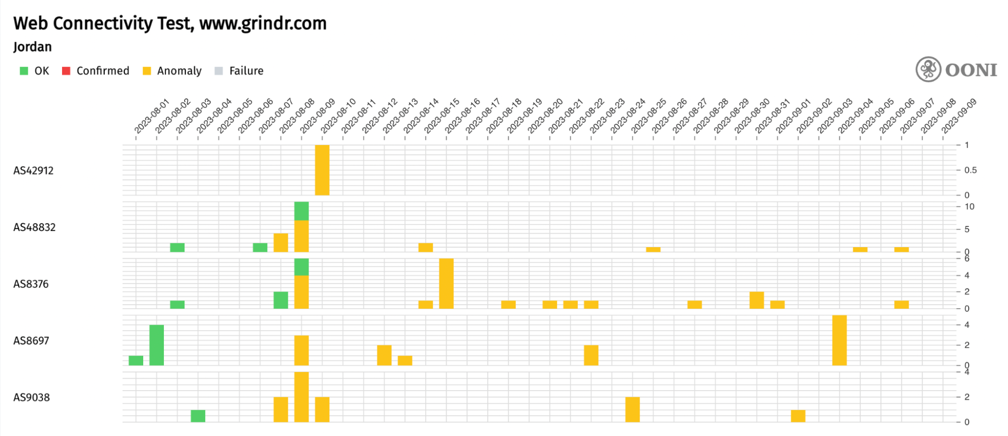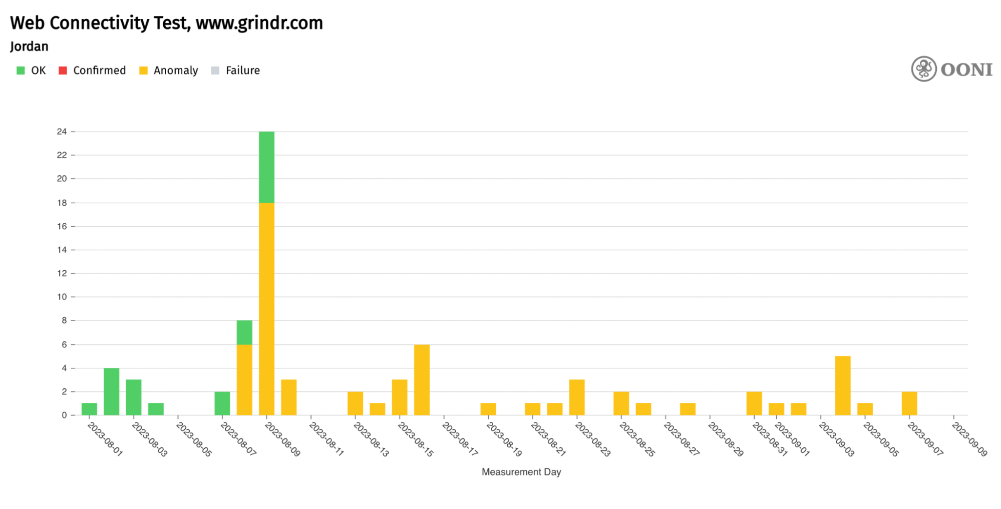 Chart: OONI Probe testing of Grindr’s website (www.grindr.com) in Jordan between 1st August 2023 to 9th September 2023 (source: OONI MAT).