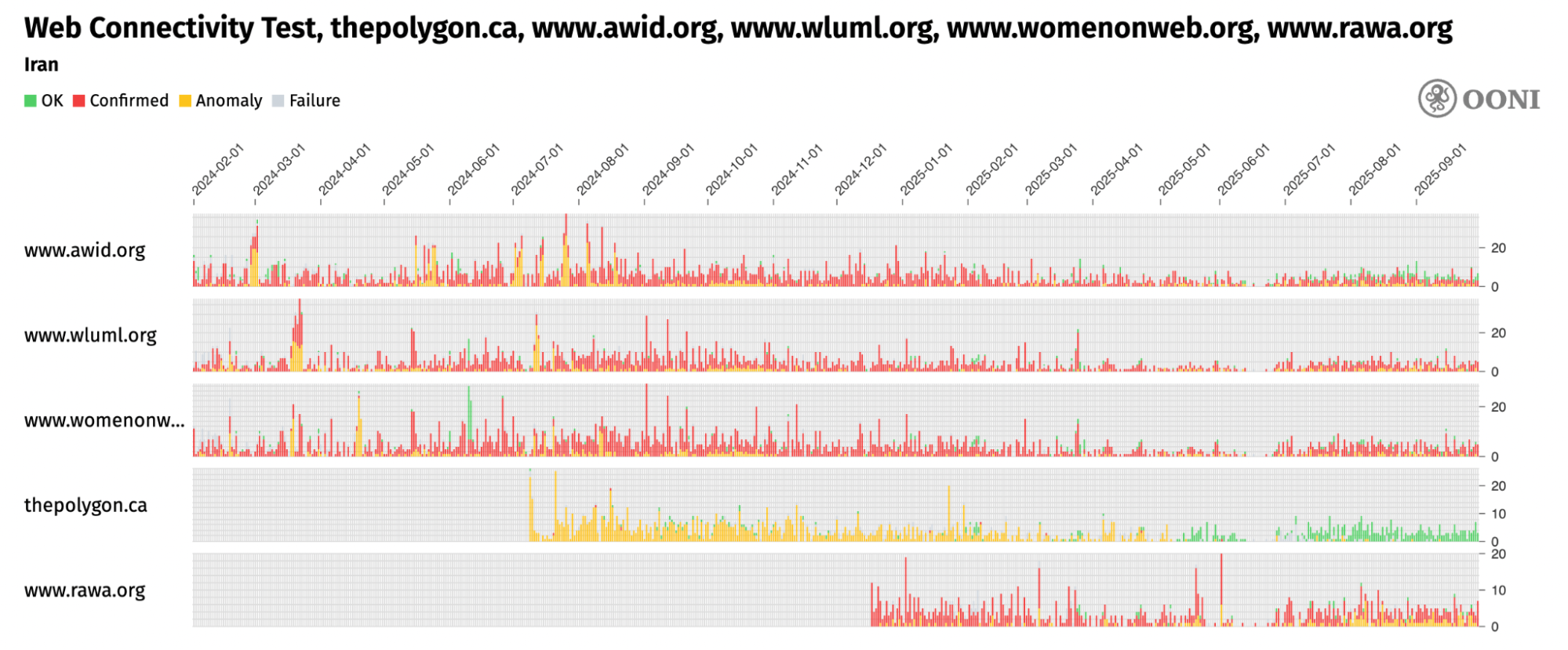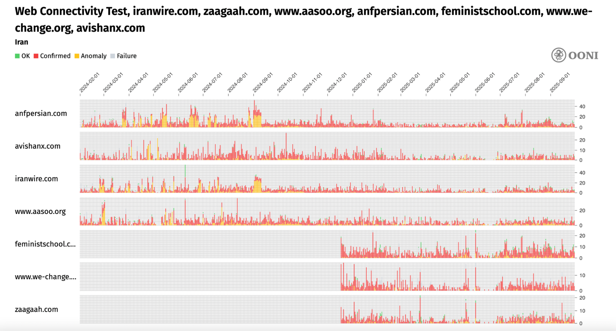 Chart: Aggregate view of blocked international women’s rights websites on all tested networks in Iran between 1st February 2024 to 1st October 2025 (source: OONI MAT).