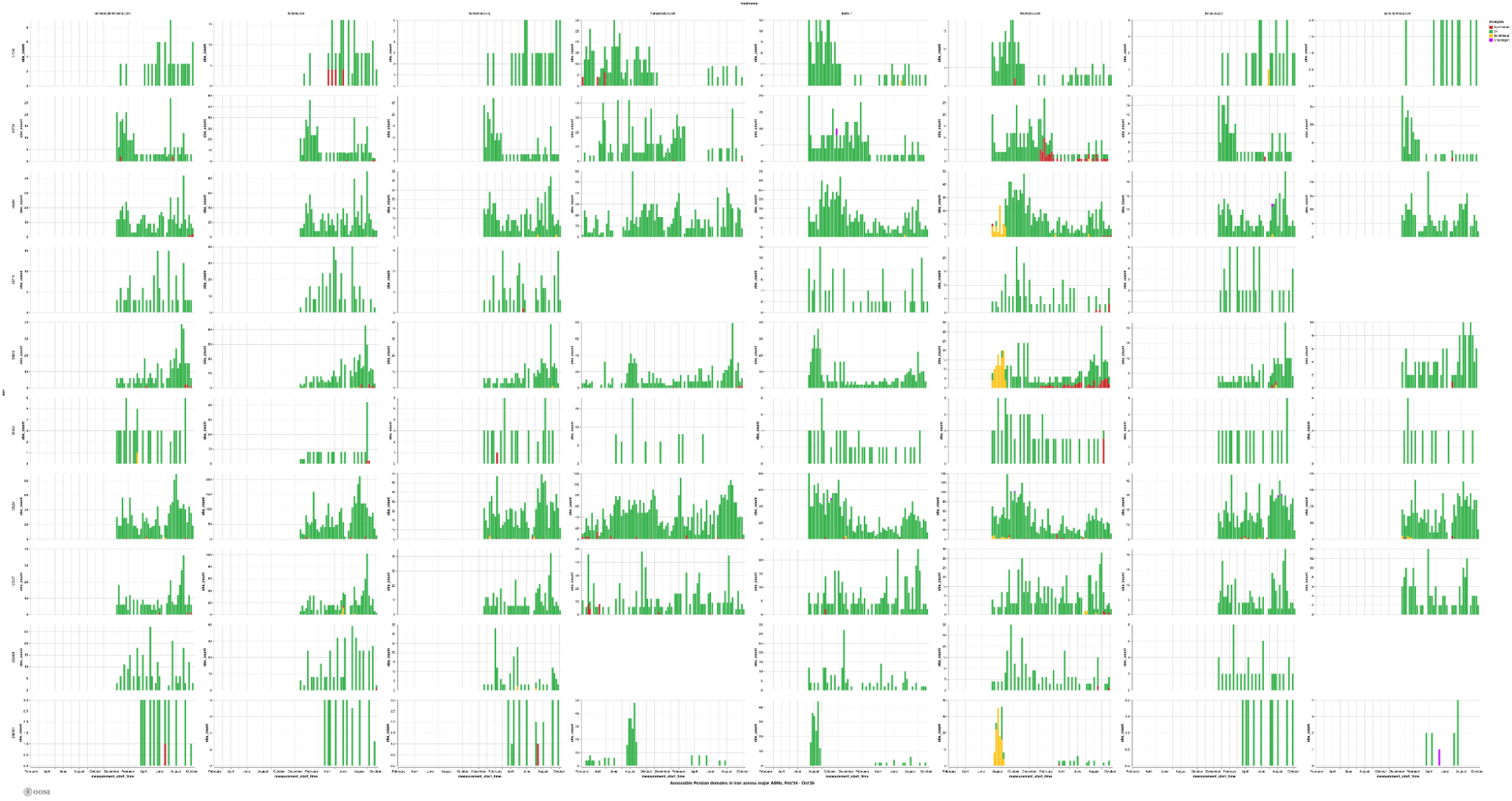 In contrast, our analysis of OONI data shows that the remaining Persian women’s rights websites from our list were mostly found accessible on ASes that received the largest measurement coverage during the analysis period, as illustrated below.