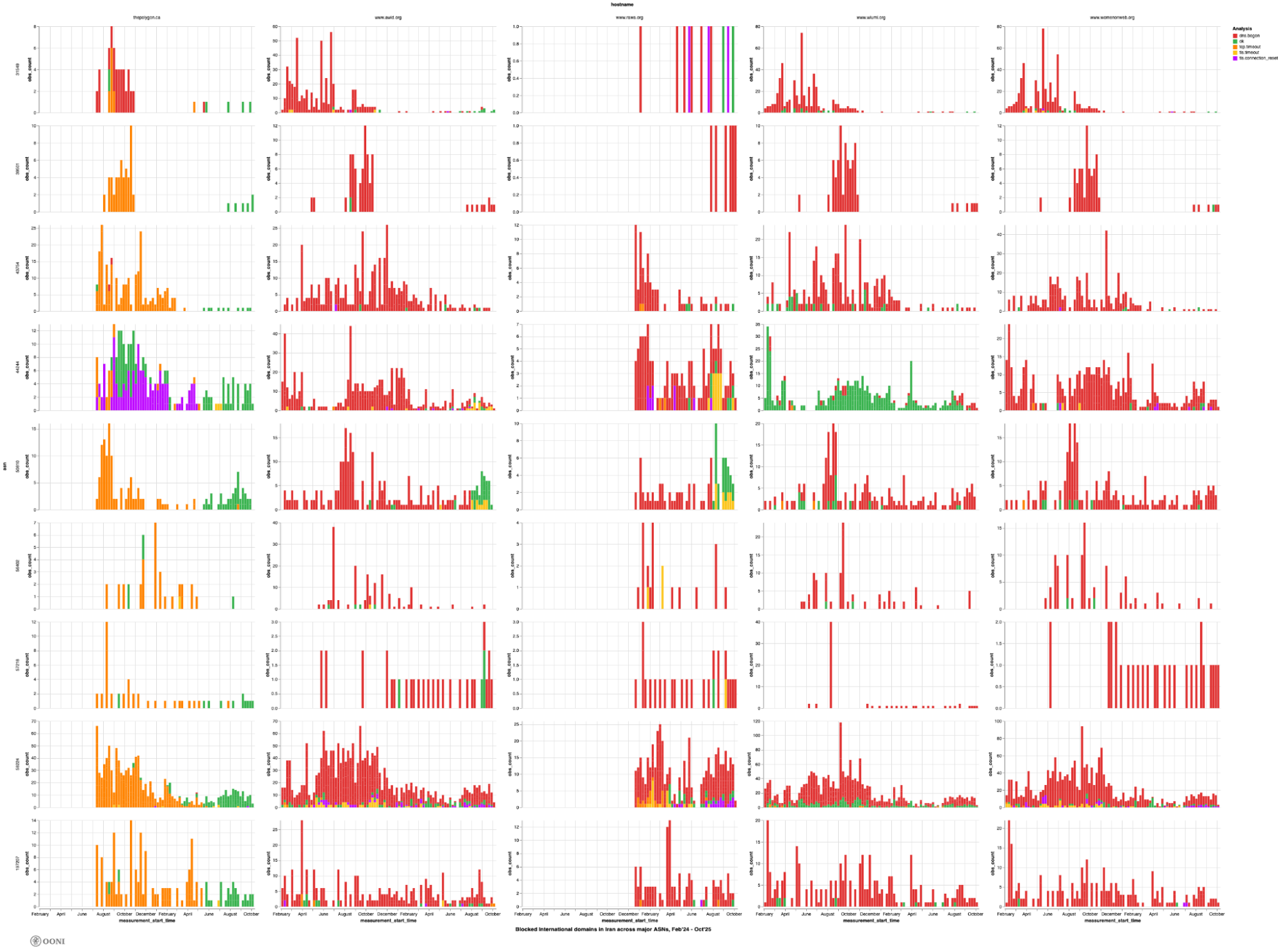 The above charts were produced using OONI Pipeline v5 and they aggregate OONI Probe measurement coverage for the 5 international women’s rights websites that presented signs of blocking on the ASes that received the largest measurement coverage in Iran between 1st February 2024 to 1st October 2025. These charts provide a breakdown of the analysis results, illustrating that while several different errors emerged in the testing, the majority of measurements (for 4 out of 5 domains) returned bogon IP addresses in the DNS answers on all major ASes during the analysis period. It is therefore evident that, similarly to the blocking of Persian women’s rights websites, DNS tampering is the primary censorship technique used by major ISPs in Iran to block access to international women’s rights websites.