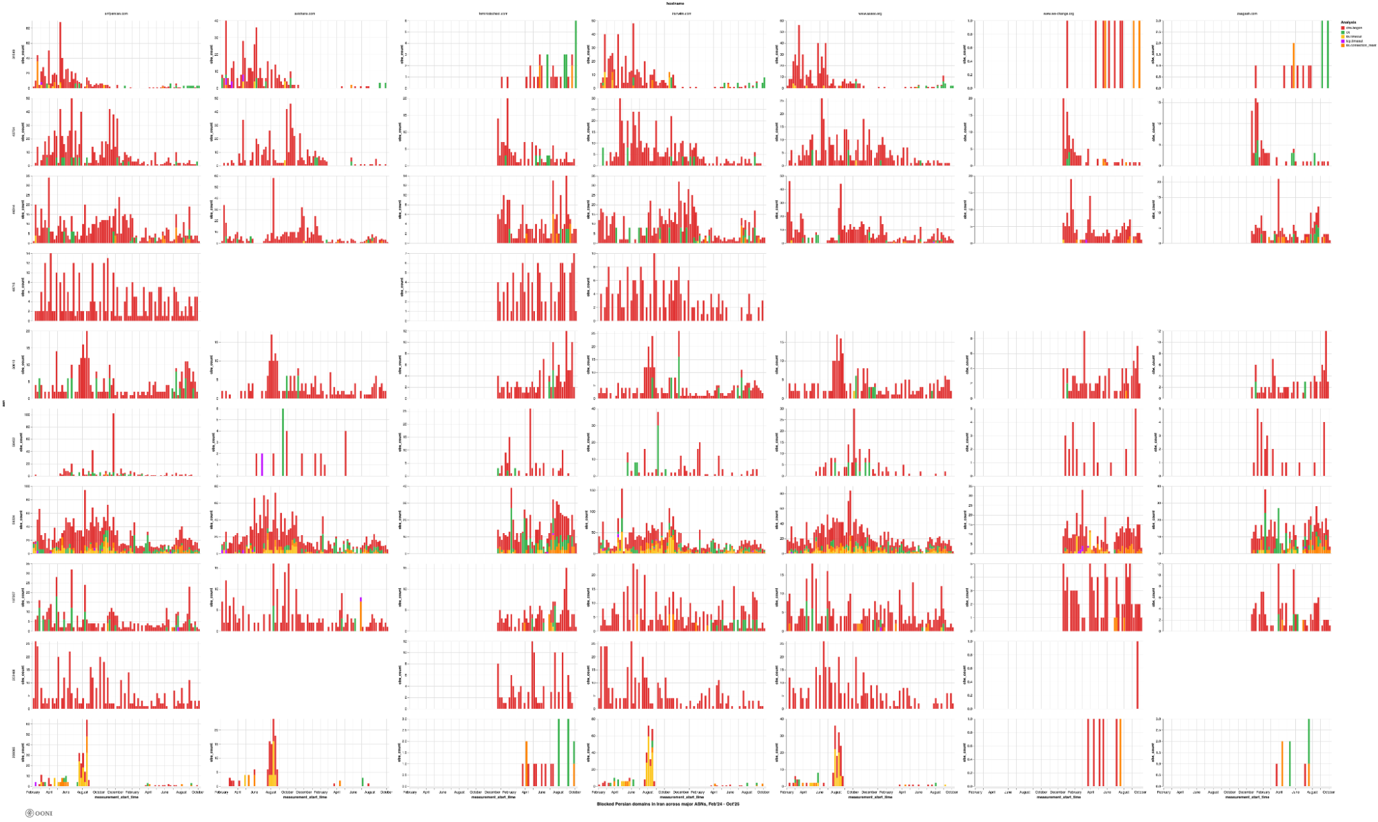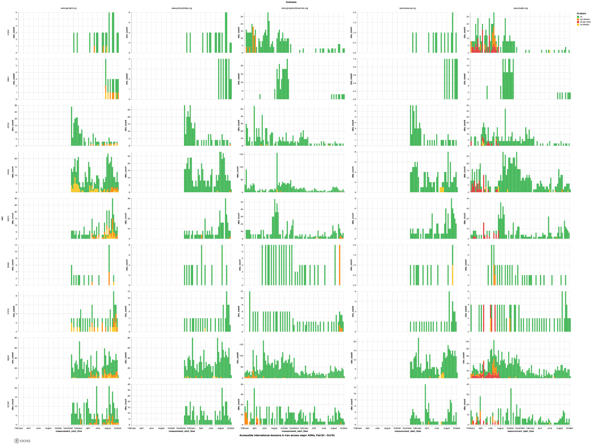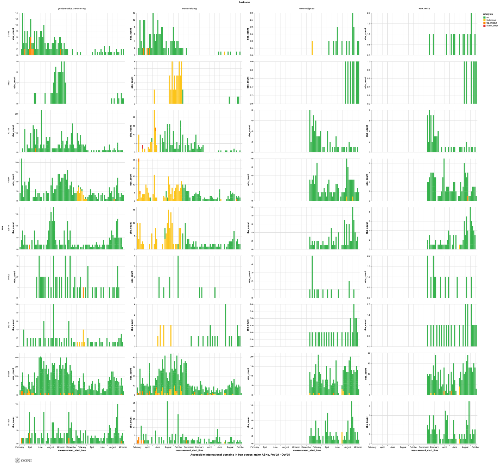 The above charts exclude womenforafghanwomen.org because no OONI measurements are available on the major ASes (that received the largest measurement coverage) during the analysis period.