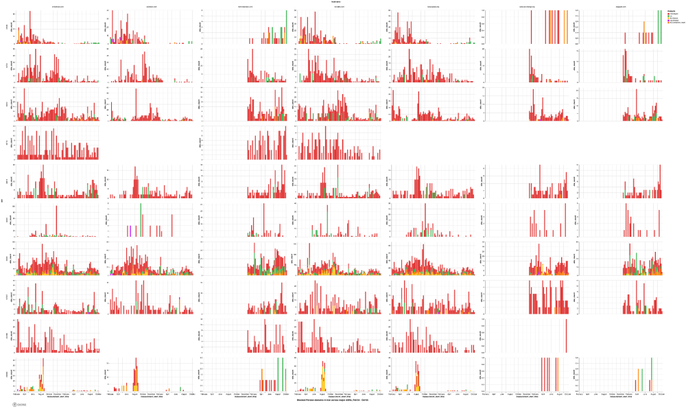 The following chart aggregates OONI measurement coverage from the testing of the blocked international women’s rights websites (listed in the above table) on multiple networks in Iran between 1st February 2024 to 1st October 2025.