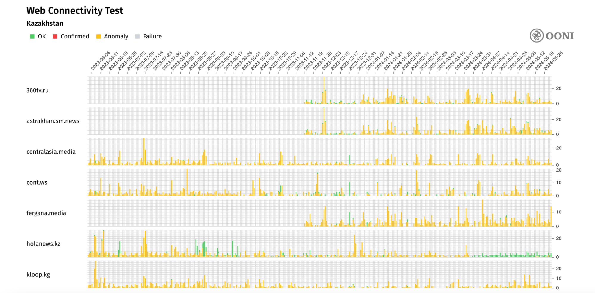 Все вышеперечисленные домены новостных СМИ в течение всего периода тестирования демонстрировали большое количество аномалий (по сравнению с общим объемом измерений), что свидетельствует о наличии блокировки. Это иллюстрируется следующими графиками, которые представляют собой совокупность измерений OONI, собранных в ходе тестирования вышеуказанных 17 доменов в нескольких сетях в Казахстане в период с 1 июня 2023 года по 1 июня 2024 года.