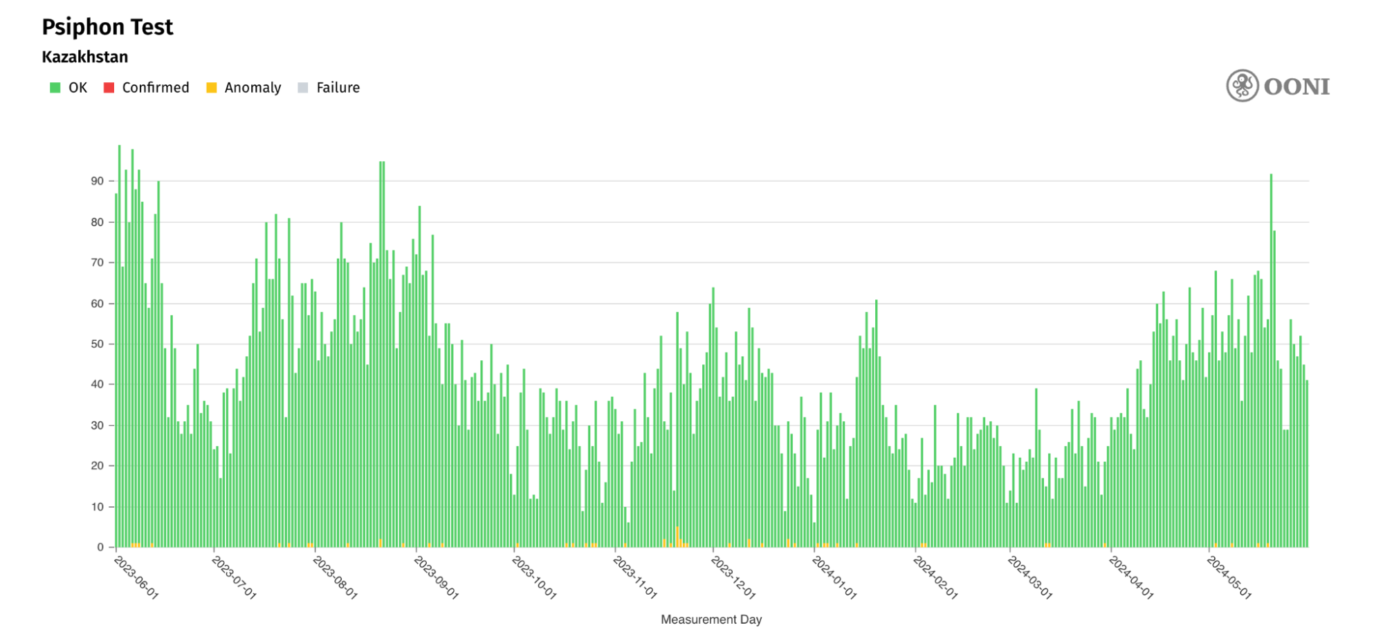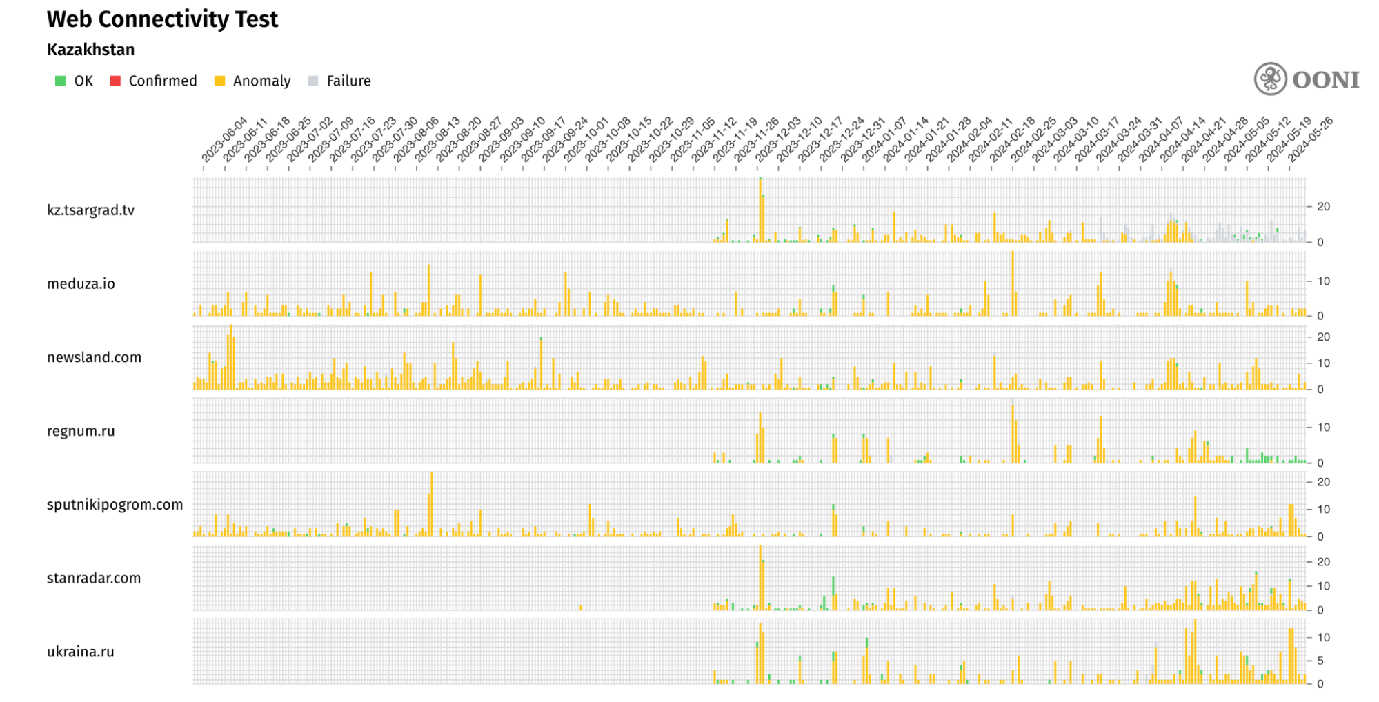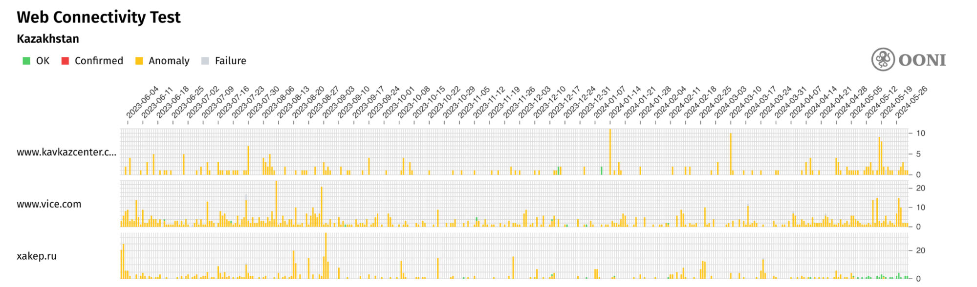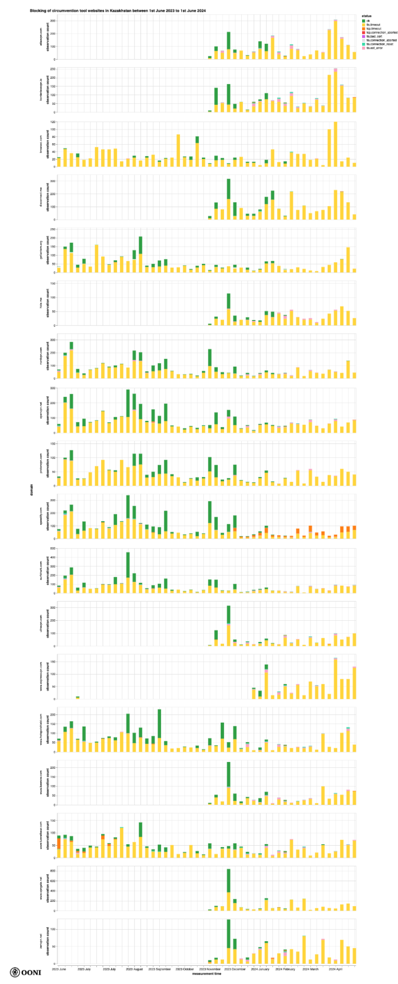 Наш анализ данных OONI, собранных в Казахстане за последний год (с 1 июня 2023 года по 1 июня 2024 года), показывает следующее: