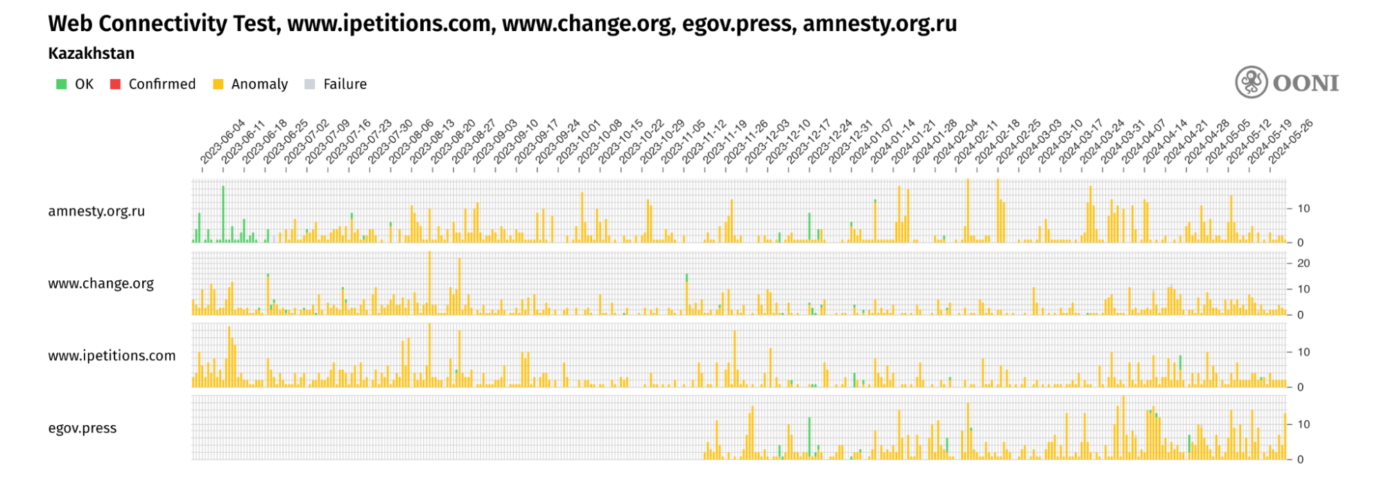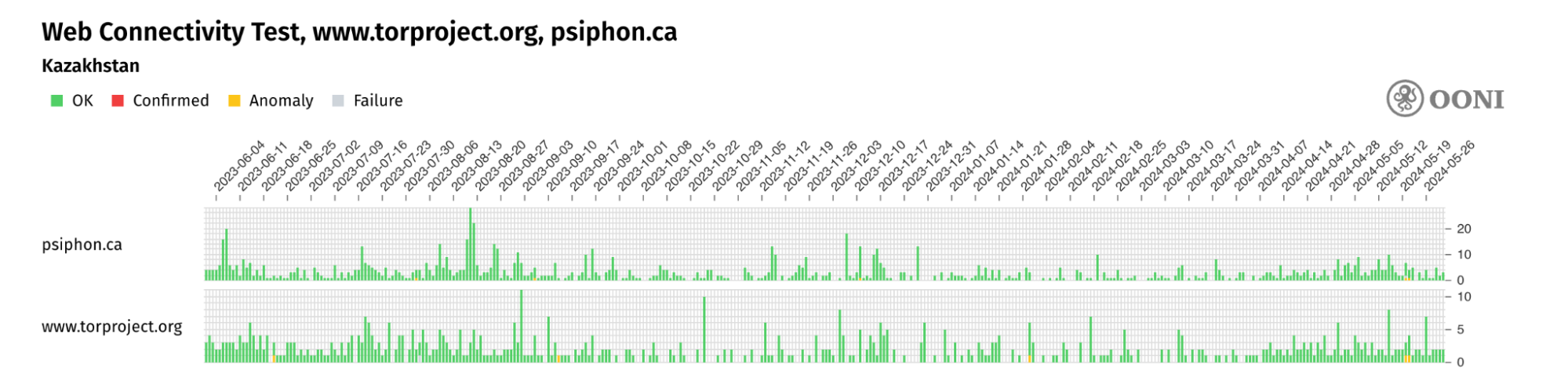 С 2012 года Open Observatory of Network Interference (OONI) разрабатывает программное обеспечение с открытым кодом (OONI Probe), предназначенное для документации различных форм интернет-цензуры, включая блокировку сайтов и приложений. Каждый месяц OONI Probe запускается волонтерами примерно в 170 странах (включая Казахстан). Результаты сетевых измерений, собранные пользователями OONI Probe, автоматически публикуются в виде открытых данных в режиме реального времени.