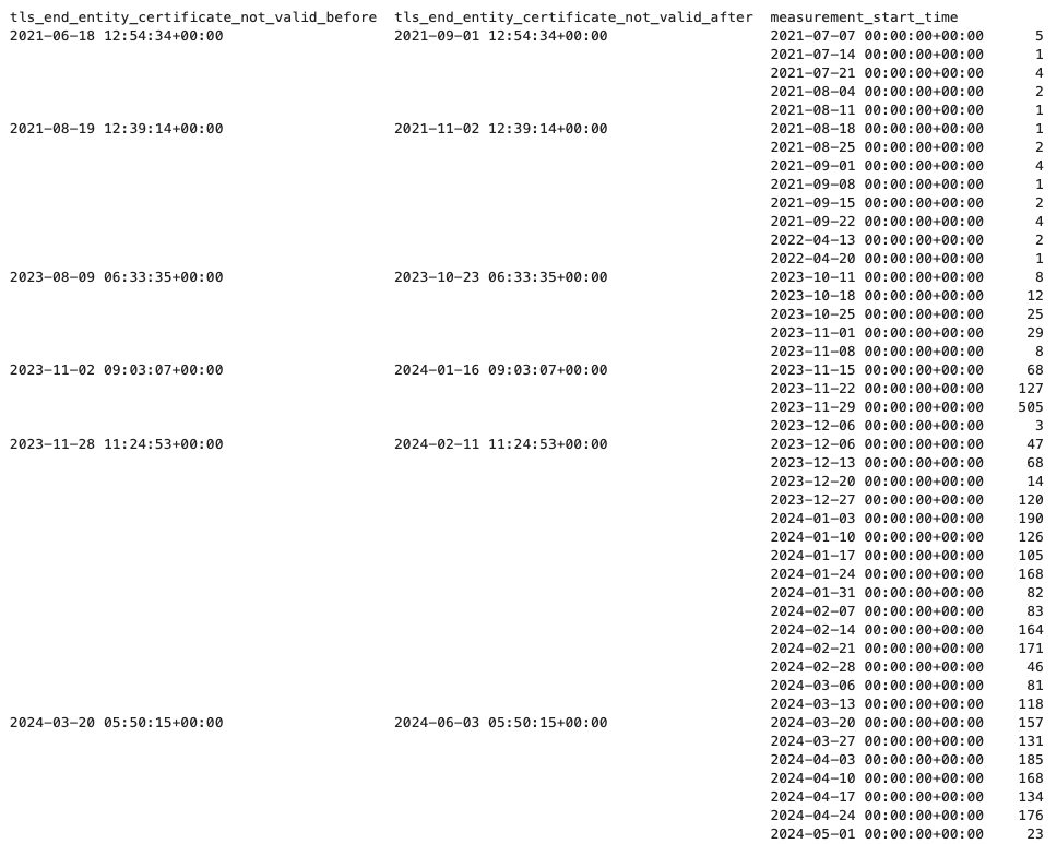 В частности, по данным OONI, собранным в Казахстане в период с 2021 по 2024 год, мы обнаружили 7 различных промежуточных сертификатов, подписанных 4 различными корневыми сертификатами, которые использовались для проведения TLS-атак типа «man-in-the-middle»(MITM), направленных как минимум на 14 различных доменных имен в 19 различных сетях в Казахстане. Мы обнаружили, что эти промежуточные сертификаты использовались для проведения MITM-атак даже в периоды недействительности сертификатов. Это вызывает обеспокоенность, так как подобная практика ослабляет конфиденциальность и безопасность пользователей Интернета в Казахстане.